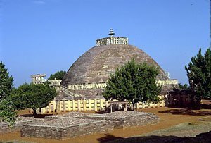 | Not all rare and priceless objects are suitable for so visible a display as the Chains of Saint Peter. In India, when the Buddha died in the 5th century BC, his body was cremated. So what do you do with Buddha ashes? Rare and priceless holy relics though they might be to the Buddhist, they could hardly put them on display. Instead his disciples divided them up and carried them to different parts of India where they placed them within stupas. Stupas are a form of reliquary unique to Buddhists and are designed to contain the relics of a saint or holy man. Stupas take many forms and continue to be built by Buddhists around the world to this day. One of the earliest and most famous that we know of is the Great Stupa of Sanchi. This stupa is in the shape of a solid dome representing the universe and is surrounded by four gates marking off the four directions. While this stupa was built some five hundred years after the Buddha's death, it was probably built over an earlier stupa that actually contained Buddha ashes. When pilgrims visit Sanchi and walk around the stupa, they are symbolically walking around the universe and the Buddha which is at its center. |