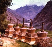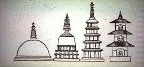 | In Tibet when a Buddhist saint dies, his ashes may also be placed in a stupa. The thing that makes a Tibetan stupa different is that the universe is not symbolised by a dome, but by shapes and colors that represent the elements of the universe. As Buddhism spread through China, Korea and Japan, the form of stupas evolved, becoming increasingly vertical in design until resulting in the multistoried pagodas found in those countries today. |